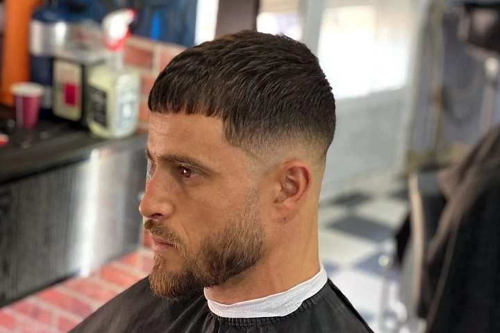 Combines Caesar with a fade. The sides simply taper down to the skin for a variation of the classic look. Sharp, fashionable, and perfect for current trends.
