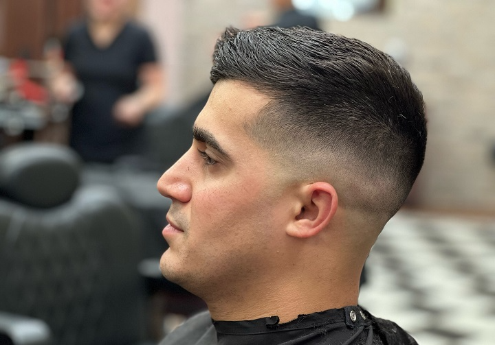 The fade starts at the top of the ears and gradually diminishes to the hair at the front, which is longer. It’s elegant and ideal for a work or casual appearance.